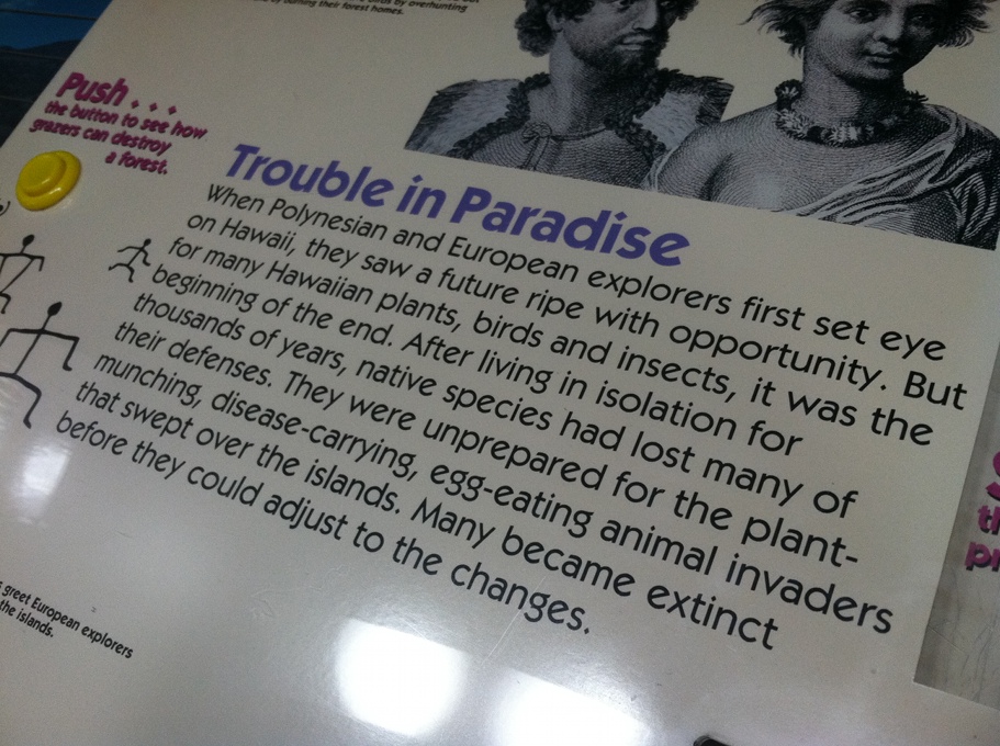Oh, these poor plant and animals who “lived in isolation” (as if they had any concept of this)  before those nasty settlers arrived on the shores of Hawaii.  The first time I read this, I thought they were referring to the explorers as the “plant-munching, disease-carrying, egg-eating animals,” but they must mean the predators and rodents that were brought into the area along with the human “animals” that disrupted the peaceful lives of the plants. Right?