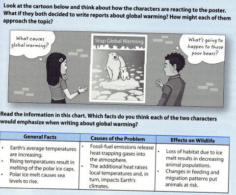 The reading samples present “information” about global warming/climate change (the kind that is the fault of human beings and “toxic” CO2, not the kind that occurs naturally in God’s wondrous creation as the result of sun cycles), the glories of alternative energy juxtaposed against the evils of fossil fuels as well as commentary from the CO2 exhaling, “carbon footprint” depositing, fabricator of inconvenient lies, bloviating billionaire guru of the “green” movement, Al Gore. And, of course, the obligatory reference to polar bears and melting ice caps. Here’s one way the global warming “debate” is framed from “different” viewpoints: